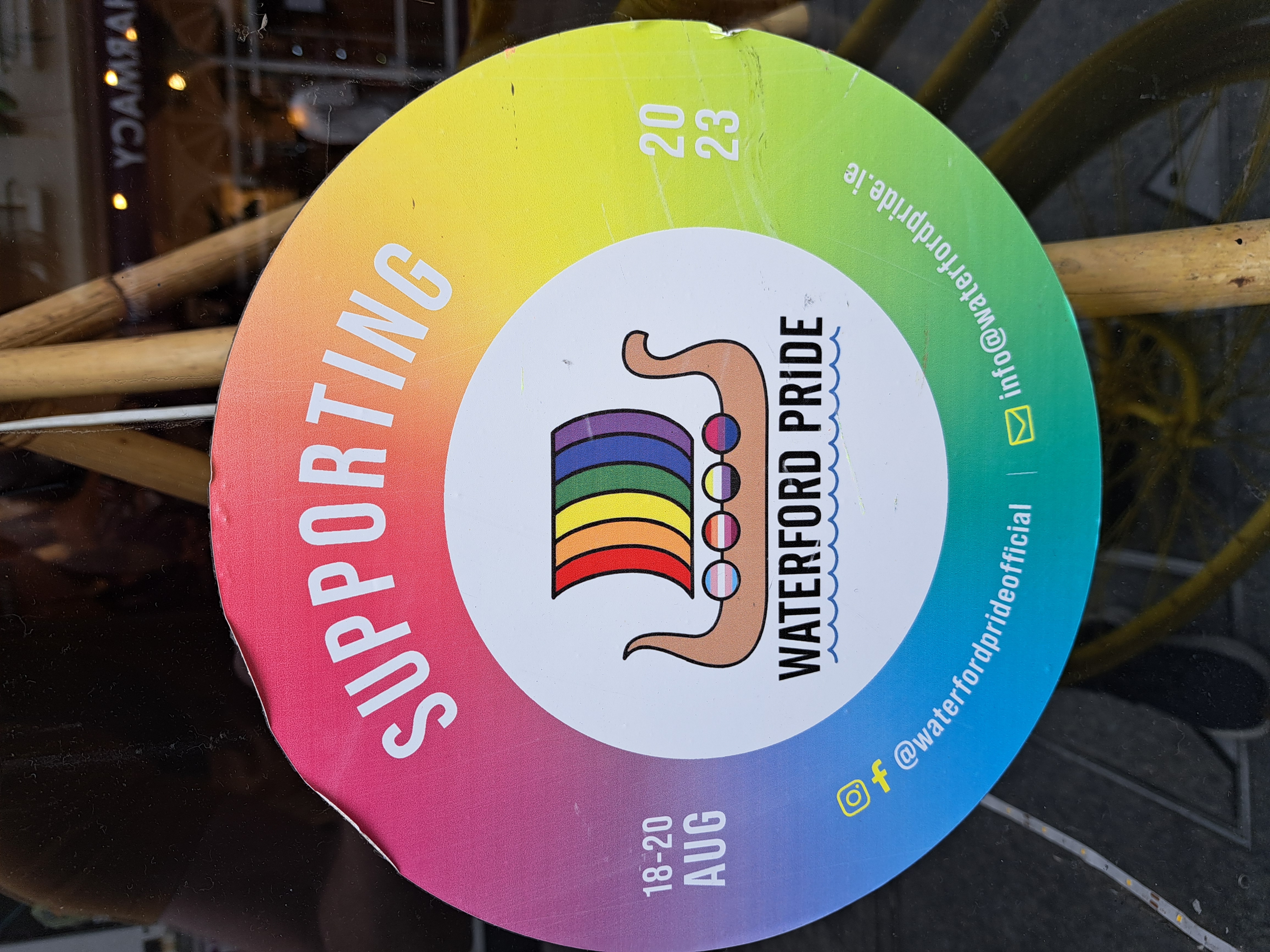 - Sticker advertising Waterford Pride 2023, and featuring Waterford Pride's rainbow Viking ship logo.