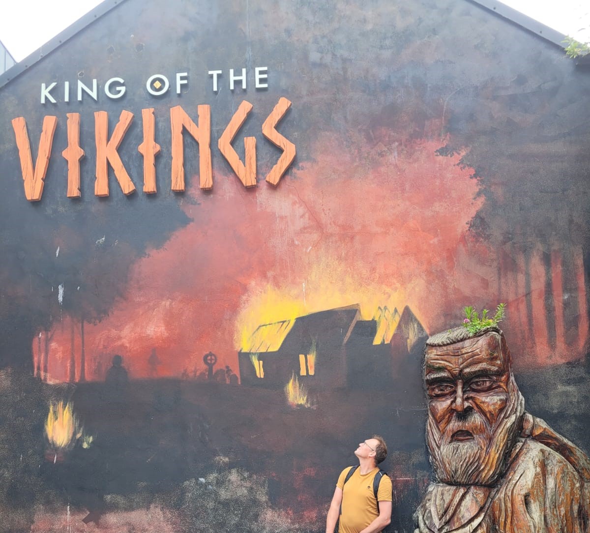 - Mural and wooden statue advertising the King of the Vikings experience in Waterford
